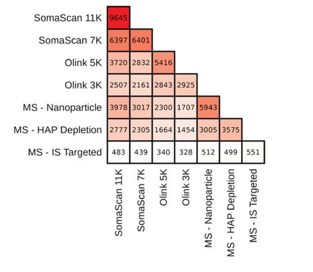 1. 定量蛋白質數量:SomaScan 11K > SomaScan 7K ≈ MS-Nanoparticle > Olink 5K > MS-HAP Depletion > Olink 3K