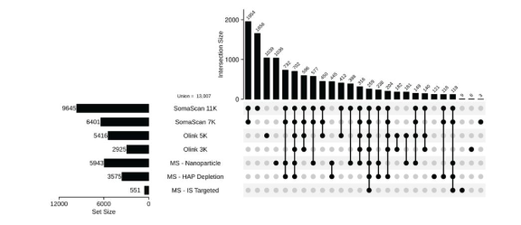 Somascan11K和MS-Nanoparticle之間蛋白組間技術最大的重疊是3978個蛋白,其次是Somascan11K和Olink 5K之間的3720個蛋白。
